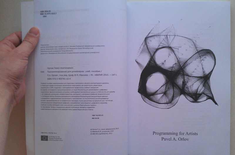 So, let me introduce my new book “Programming for Artists”. The book was published in Russian language with a help of European Union: the organization of the Tempus project 544083 “Enhancement of Russian creative education: new Master program in Digital Arts in line with EU standards [ENMDA]”. This book can be found in the libraries of Russia and several copies will be located in the polytechnic university library. I would like to say thank you for the Department of Engineering graphics and design for the help with publication, some pages are colored in printed edition, which is nice.